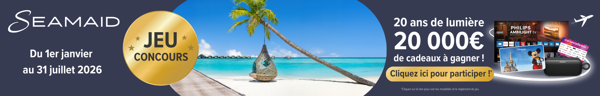Ce nouveau catalogue met également à l’honneur un moment important : les 20 ans SEAMAID ! Pour fêter ça, nous organisons un Grand Jeu Concours pouvant faire gagner au consommateur final des lots d’exception dune valeur total de 20 000€ de cadeaux !